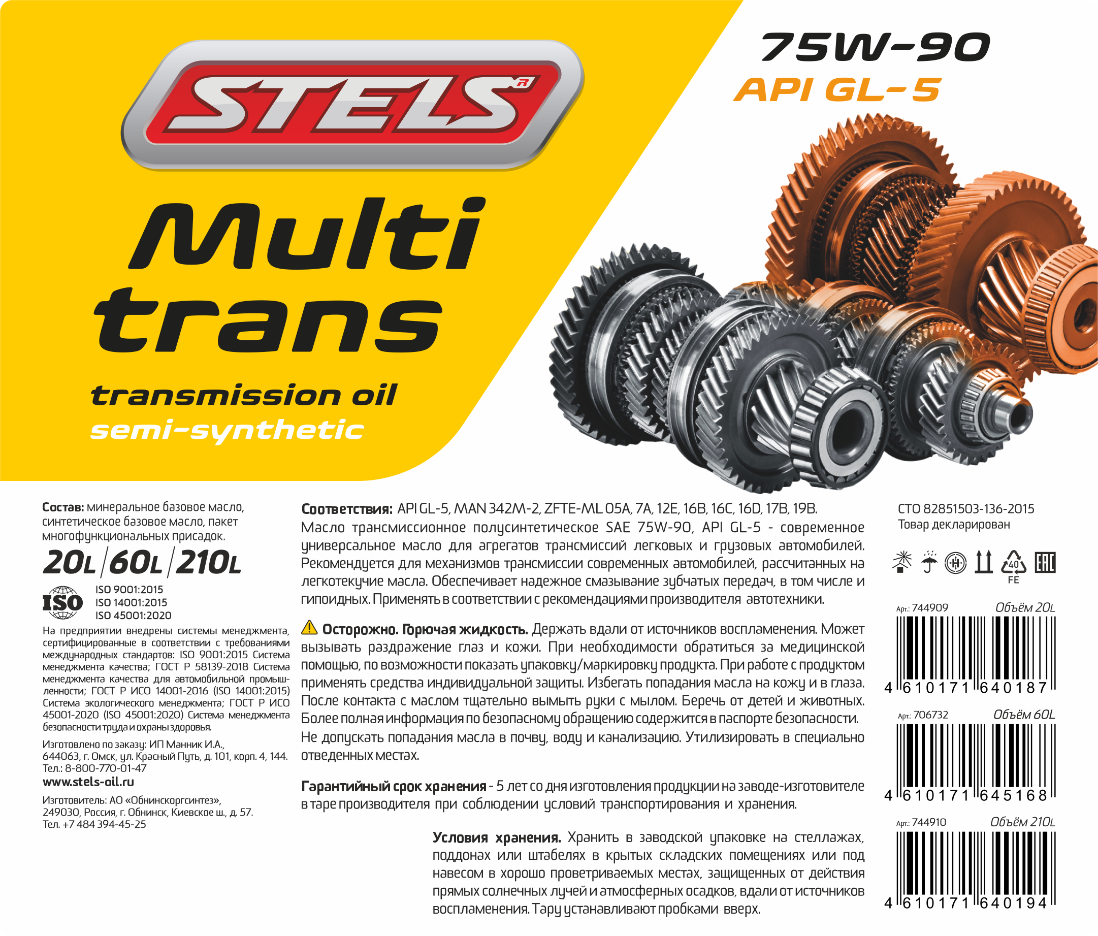 Масло трансмиссионное STELS Multitrans 75w-90 GL-5 60л